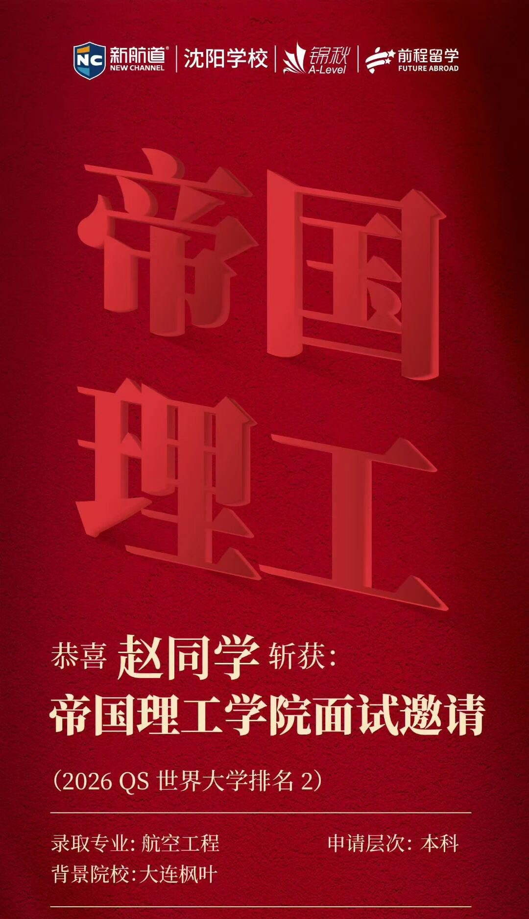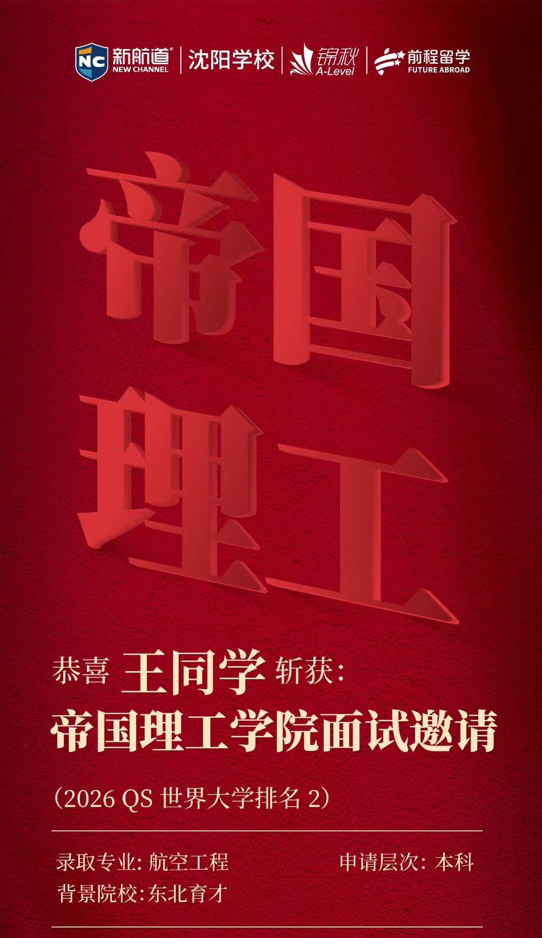重磅双响!锦秋学子王同学(东北育才)、赵同学(大连枫叶)双双斩获帝国理工学院航空工程面试邀请!QS 2026全球第2的顶尖工科殿堂,再次见证东北学子的硬核实力!